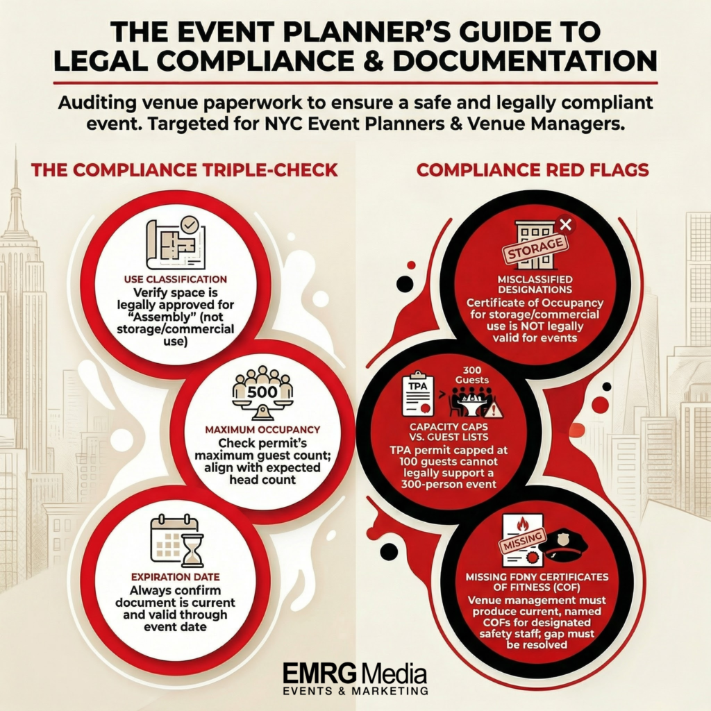This guide gives corporate planners, marketing directors, and company leaders the complete, 2026-updated picture — from the documents you must request before signing a contract to the neighborhood-level rules that catch even the most experienced teams off guard. Already facing a tight deadline or a complex venue? Contact the EMRG Media team today to let our experts handle the vetting, compliance, and planning for you.